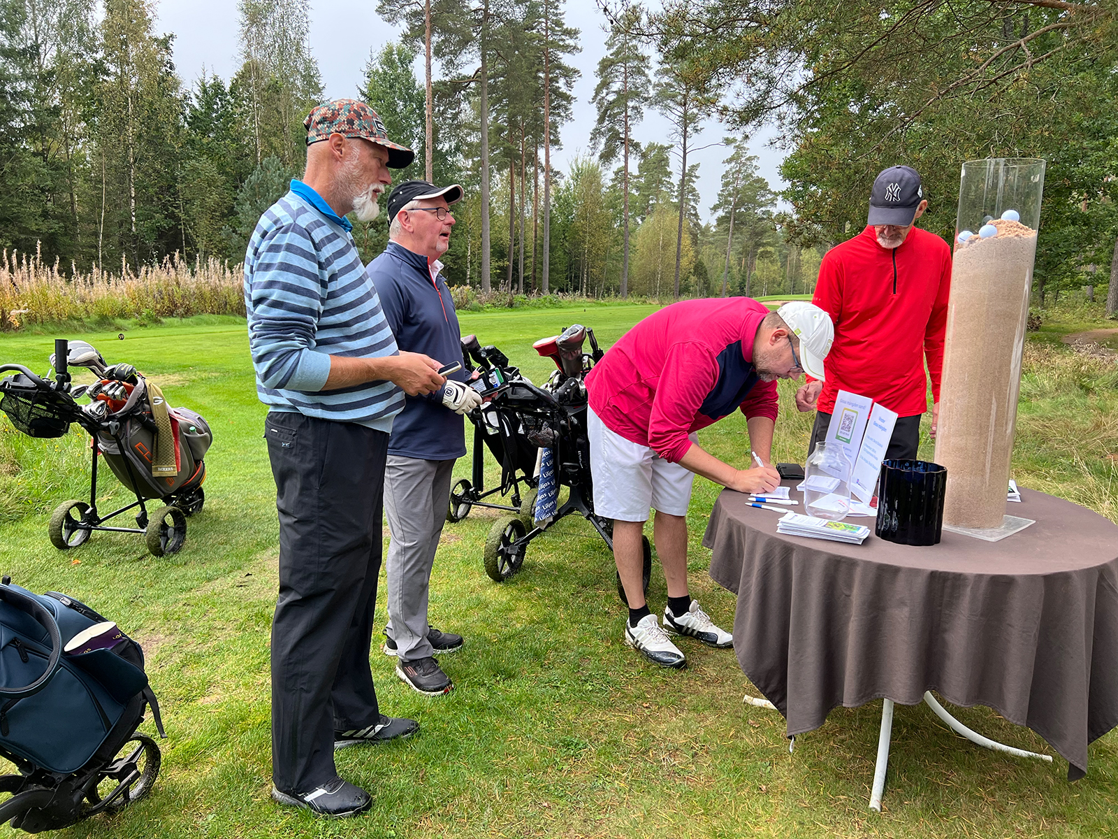 Vid hål 12 stod representanter för Cancerstiftelsen och där kunde man Swisha och gissa mängden bunkersand. Tre vinnare fick fina priser skänkta av Skrufs Glasbruk och ICA Supermarket Alvesta.