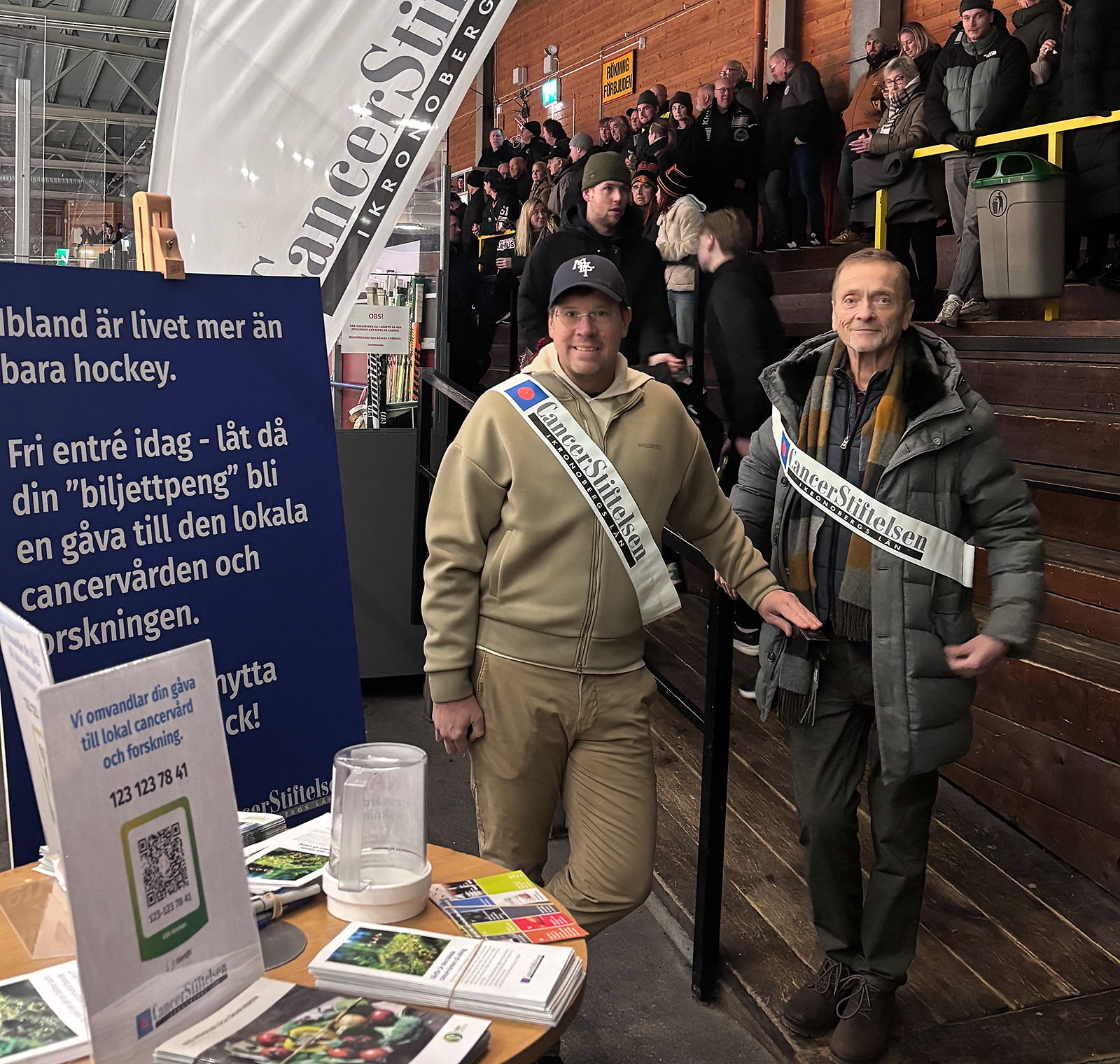 Här möttes publiken av Patrik och Göran från Cancerstiftelsen med uppmaningen att omvandla ”biljettpengen” till en gåva för den lokala cancervården och forskningen istället. I högtalarna och på storbildsskärm upprepades uppmaningen regelbundet och ett och annat bidrag droppade in.